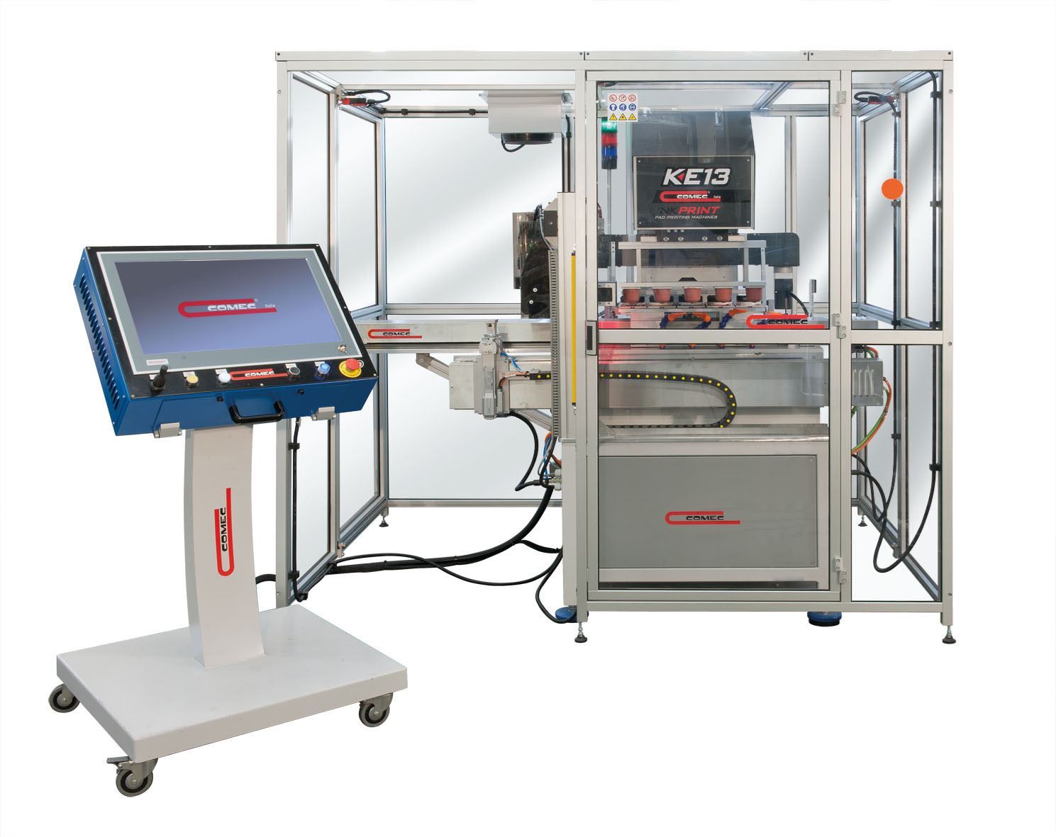 Движения горизонтальных и вертикальных колодок полностью моторизированы бесщеточными; пресс может печатать до 5 цветов с герметичными чернилами диаметром 90 мм, линейный перенос с одним позиционированием с бесщеточным двигателем для перемещения монеты между одним цветом и другой, автоматическая и программируемая очистка прокладок, горячий воздух Hot Wind 200 с насадками, которые можно включить тампоны, сенсорный экран ПК удаленно подключается для удаленной помощи.